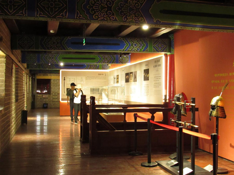 第一张图,这张写实摄影风格的图片展示了博物馆内的参观场景。背景的天花板彩色装饰和橙色砖石墙壁颇具特色,营造出独特氛围。画面中的男女像是在认真参观展览,男性戴黑帽、着深色衣裤,女性留着黑色长发、身着白色上衣和深色下装。右侧摆放着古代头盔和兵器,旁边墙上还有相关文字说明,整体灯光柔和,庄重的氛围凸显了展览内容的历史感。