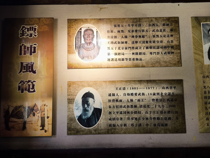 馆内展室以详实、丰富的实物资料,客观全面地介绍了 中国 镖局发展史以及在明清时期 中国 有名的十大镖局、十大镖师和走镖过程中的轶闻趣事;展示了当时古代镖师曾用之物:镖箱、镖车、兵器和生活用过的烟具、烟桌、家具、书画、瓷器、木器等,以及他们的生活习惯和江湖行规;揭示了镖局在 中国 封建社会后期对商品流通领域做出的贡献。本馆不仅对研究 中国 镖局行业的历史,尤其为研究形意拳、长拳、弹腿、长枪等武术提供了不少的实物资料,是三晋大地又一处文化资源和人文景观。