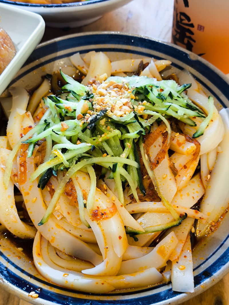 在平遥,除了莜面栲栳栳外,还有一种面食同样值得一试,那就是剔尖。剔尖是山西地区特有的一种面食,以其独特的制作方法和口感而著称。将和好的面团放在特制的剔尖板上,用特制的剔尖工具将面团一根根剔入沸水中煮熟,就得到了剔尖面条。