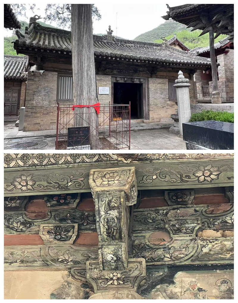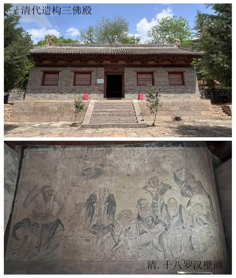 第一张图,这张图片由上下两部分组成,共同展现了清代的建筑与艺术之美。上部是清代遗构三佛殿的景象,砖石结构的建筑搭配传统中式屋顶装饰,门前台阶与绿植环绕,尽显古朴庄重;下部是清・十八罗汉壁画,以灰色墙面为底绘制的罗汉形象,风格古朴写实。图上的文字分别对上下部分内容进行了说明。整体呈现出浓厚的历史文化氛围,让人感受到清代建筑与壁画艺术的魅力。