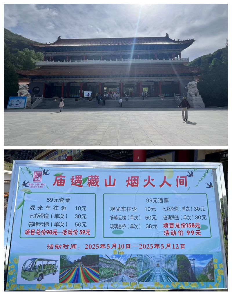 我们到访的这一天正值阴历四月十四,景区内正在举行庙会活动。庙会期间,藏山不仅免门票,还举办了各种丰富多彩的文化活动。我们购买了交通票,乘坐电瓶车穿梭在景区内,感受着这份古老与现代交融的热闹与喧嚣。
