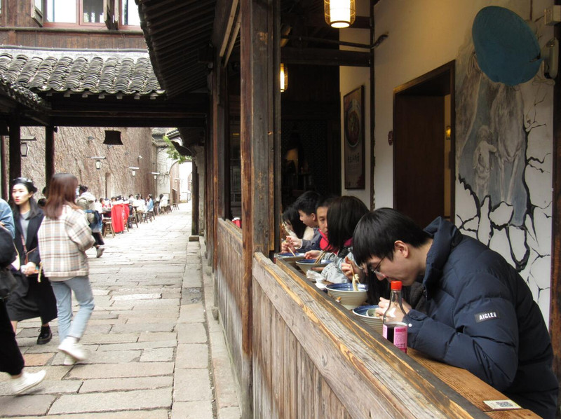 离开泰康杭州养老社区后,我们の团乘坐巴士于下午四点左右抵达乌镇西栅,之后大家在景区里自由活动。我与父亲在刚进入景区后,在街边饭桌扫码品尝书生面馆の羊肚面,临近傍晚又选了家靠近河流の民宿吃小吃。天黑后大家陆续离开景区在停车场集合,晚上大家被安排在开元名庭酒店休息。