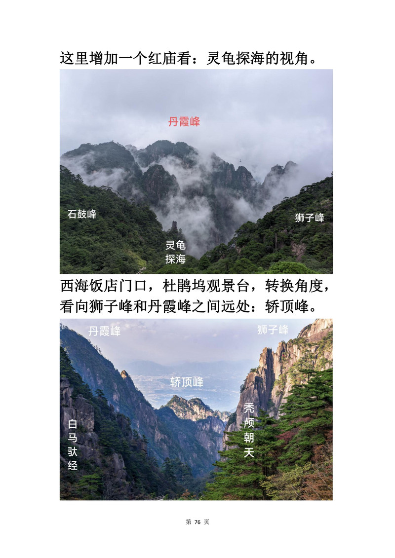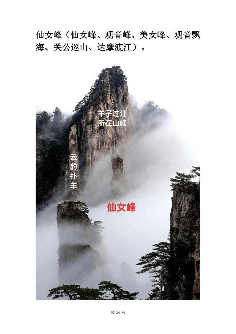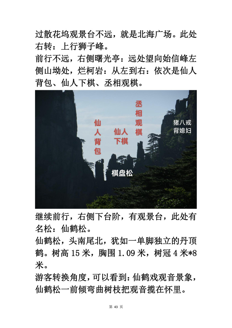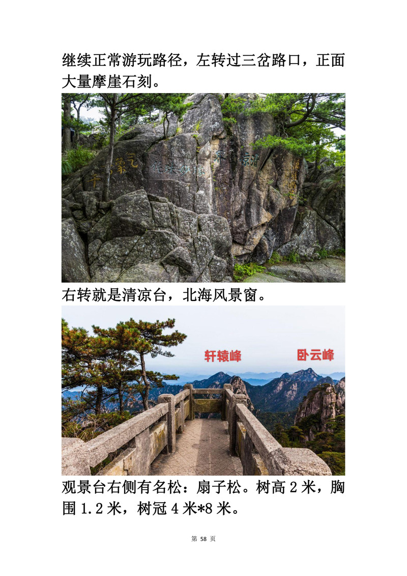 共400页,562张照片,景点555张+路线导览图5张,罗列:245个怪石;112座山峰;59株奇松;50处洞、桥、坡、道;56个观景台(亭);10个瀑布(泉、池);5个塔(庙),35个摩崖石刻,共计572个景点。