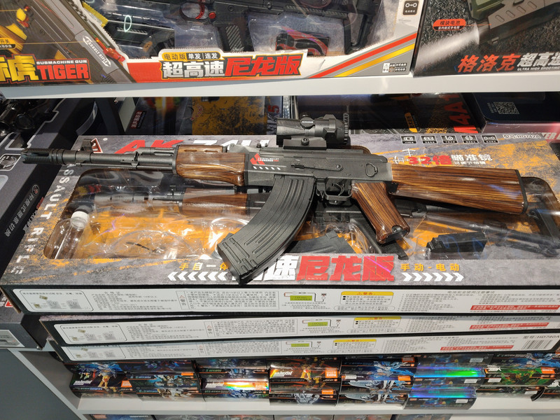 吃好披萨,地下一层的超市转转。有家很大的玩具店。大老爷说他今天农历生日,要买把枪。这把仿真玩具枪和真枪大小尺寸一样。在无锡还真没见过有得卖。