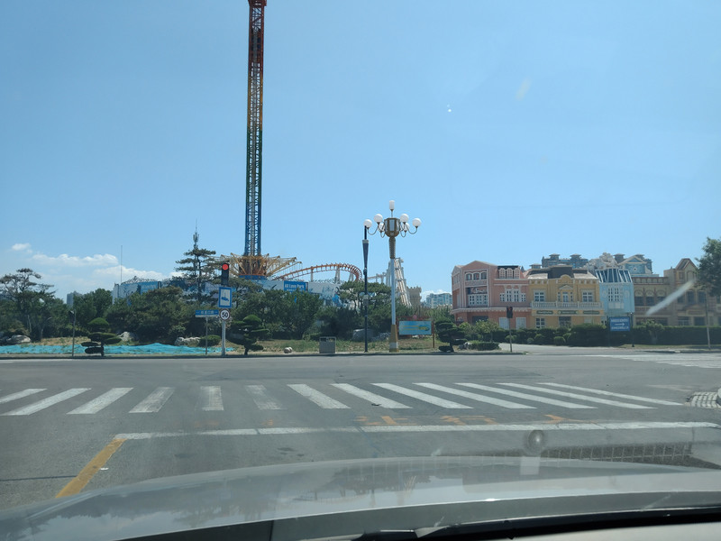 都在找车位。所以獐岛这一段拥堵缓行。没办法只能让老婆儿子先下车去玩。还好往前几十米有个停车场,门口的栏杆是抬着的。开进去也没人收费,竟然有个空车位,就是不大好停。不过无非就是多倒车几把。停好车走过去找他们。