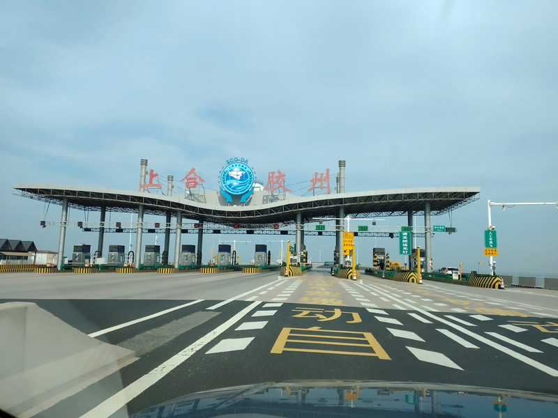 从胶州上合收费站进入胶州湾大桥。周六周日,9座以下客车,从青岛端的收费站至胶州上合收费站来回双向是免费通行的。今天是周六,上去免费体验一下胶州湾跨海大桥。
