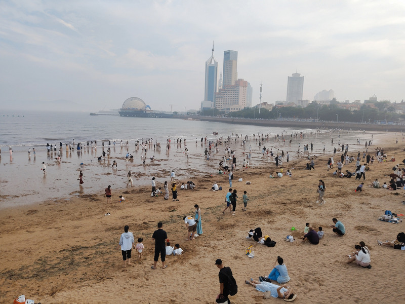 栈桥海滩边挖贝壳赶海的人不少。