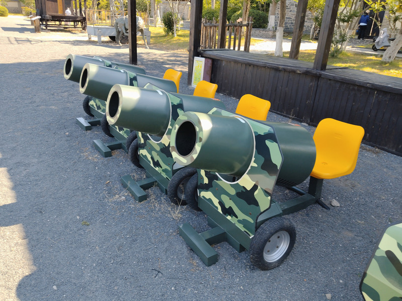 振扬门进去后,左侧是去古船博物馆。右侧是去戚继光纪念馆。戚继光纪念馆门口的练兵场上有空气大炮。上次寒假在惠州西湖也看到过的,扫炮身上的二维码后就可以玩了。大老爷表示他长大了,对这个没啥兴趣。