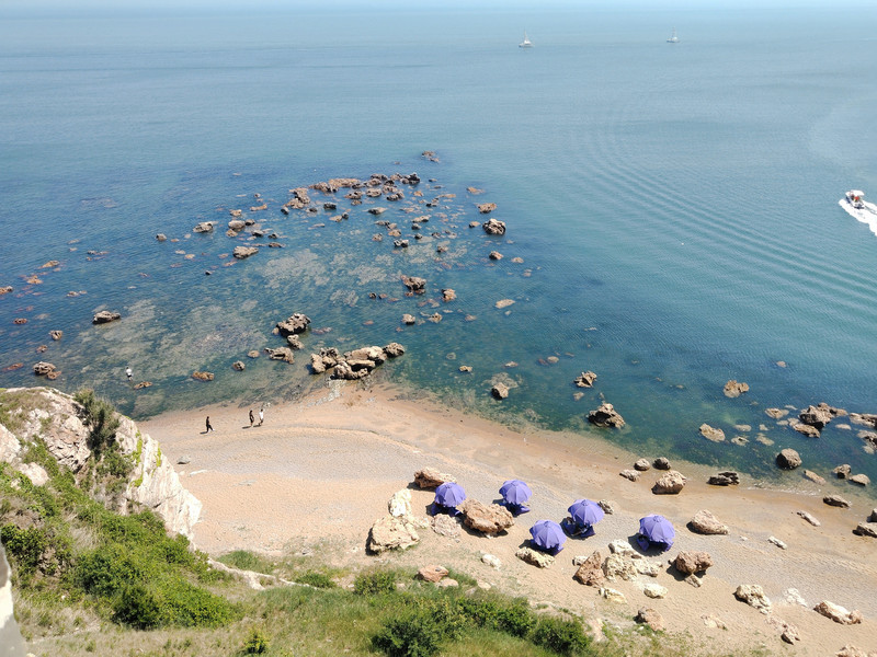 坐在索道上,看看海景。老婆说从旁边的路上山其实也没多远,看似山路也不算陡峭。我说坐在索道上看的角度,和实际爬上去是不一样的。爬上去肯定很累的。关键太晒了!几乎都是坐索道上山的。没几个人在爬山。一同车厢里的一对老夫妇听的懂我们说话。他们是苏州自驾过来的,出来了十几天了。他们说不走高速,走的是国道,反正不急慢慢开。我们没办法,小孩只有寒暑假有空出来玩。回去还要上课。只能走高速赶时间。退休生活真是惬意!