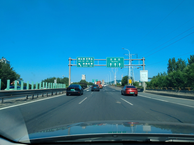 进入烟台市区,走了一段G15沈海高速,市区这一段高速是免费的。这个分道口往左就是去烟大轮渡口了,从那里可以去大连。将来有机会一定要去体验一下。据说在船上早上可以看到海上日出。