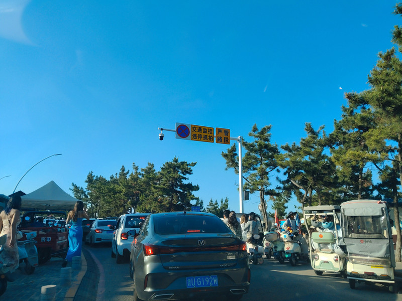 獐岛这里开始堵车了。这里道路急转弯又狭窄。汽车,电动三轮车,都挤在一起。感觉骑电动三轮车挺危险的,而且没人戴头盔。岛上对此的管理似乎有点不到位。去年春节去的南澳岛,对租的电动车安全管理就严格到位多了。