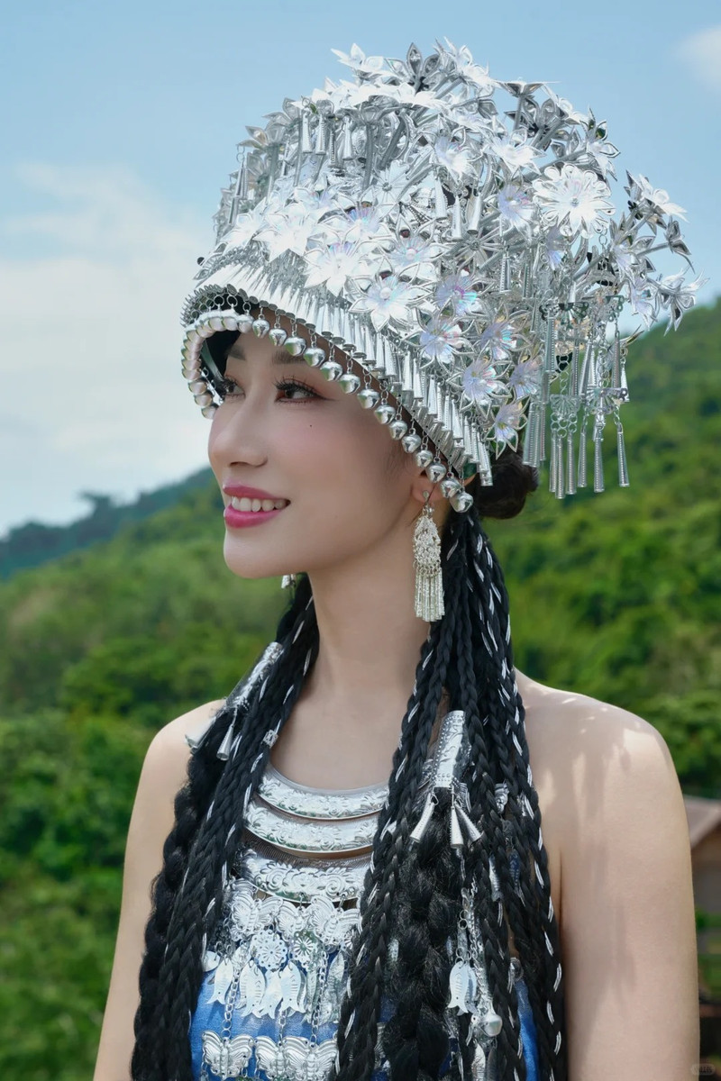 银饰装饰:苗族女性在重要场合会佩戴大量的银饰,如耳环、项链、手镯等,体现了对美的追求和对财富、地位的重视。