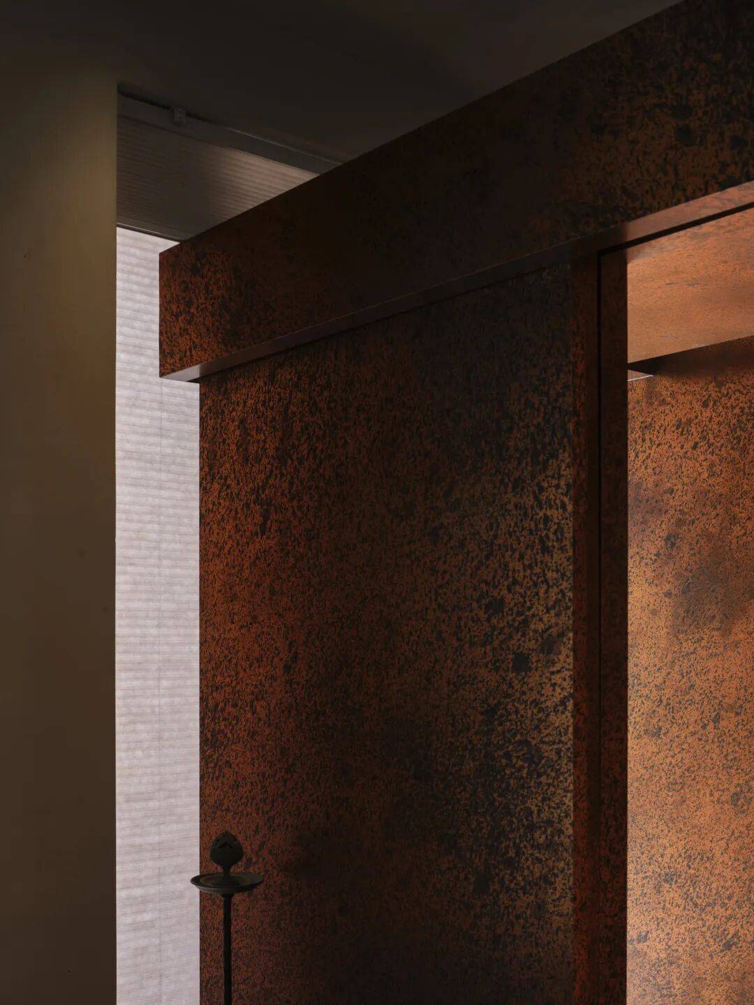 - 开口设计:红铜盒子的四个立面、顶面均设有开口,并与外墙体之间留有空隙,使得光线可以穿透盒子到达铺装黑青石的区域。