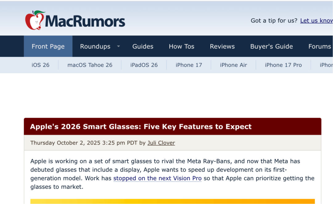 据海外科技媒体MacRumors透露,苹果正加速研发一款智能眼镜,旨在与Meta的雷朋系列展开竞争。面对Meta已推出带显示屏的智能眼镜,苹果希望加快其首代产品的开发进程,甚至已暂停下一代Vision Pro的部分工作,以优先推进眼镜产品上市。