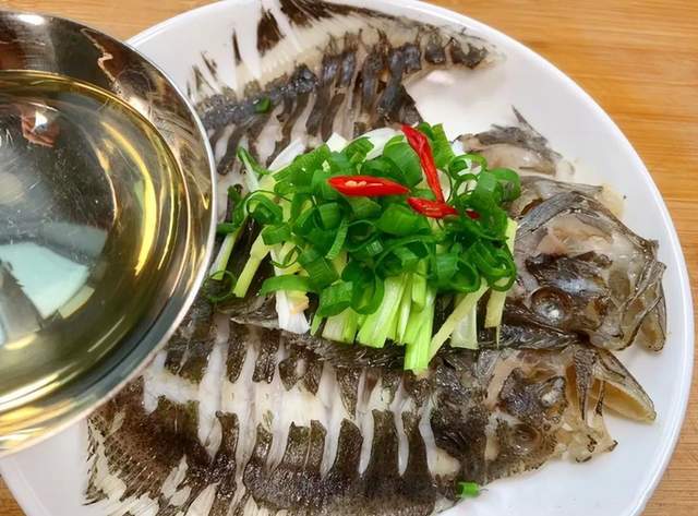 烧一点热油,油热到微微冒烟的时候,均匀地浇在葱姜丝上,听到“刺啦”一声,香味瞬间就出来了,最后沿着盘子边缘倒入蒸鱼豉油,千万别直接浇在鱼身上,那样会抢了鱼的鲜味。
