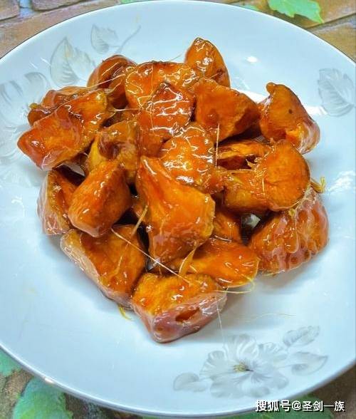 5.把红薯倒入锅中,快速翻炒均匀,让糖浆能均匀裹在红薯表面。接着把炒好的红薯盛出装盘,再用剩下的糖浆持续拉丝就行