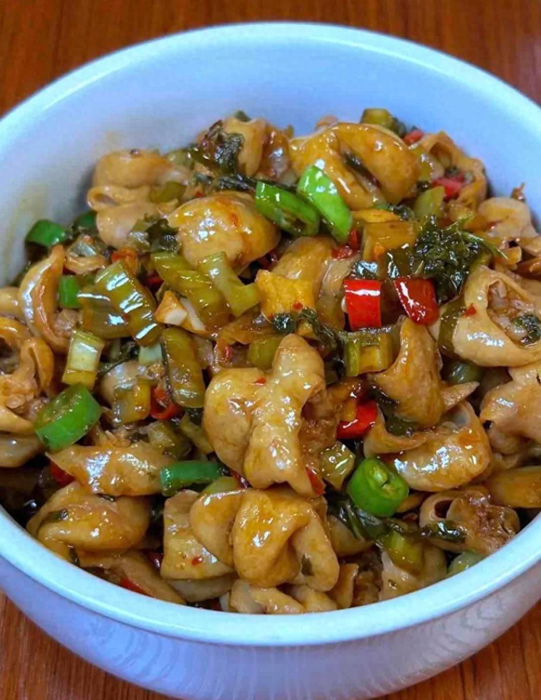 酸菜炒肥肠,这道菜在九十年代是真正的“穷人乐”。肥肠的处理非常讲究,需要反复清洗,去除异味,但又不能洗得太干净,否则就没有那种独特的香味了。酸菜的酸爽和肥肠的浓香相结合,形成了这道菜独特的风味。