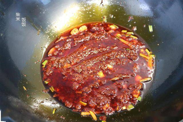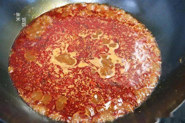 热油炒香蒜末、干辣椒、豆瓣酱,加入火锅底料炒出红油。