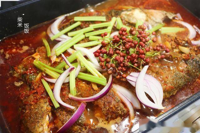 7,把煮开的汤倒进盛放鱼的锅里。上面再撒些洋葱、芹菜和鲜花椒。然后淋入热油,插上电,煮5分钟左右,把底部的蔬菜煮熟就可以了。家庭版的烤鱼也就好了。
