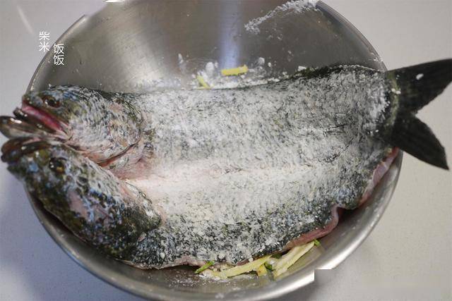 2,鱼腌好了,表面撒些淀粉涂抹均匀。我这里用的是豌豆淀粉,其它淀粉也都可以。