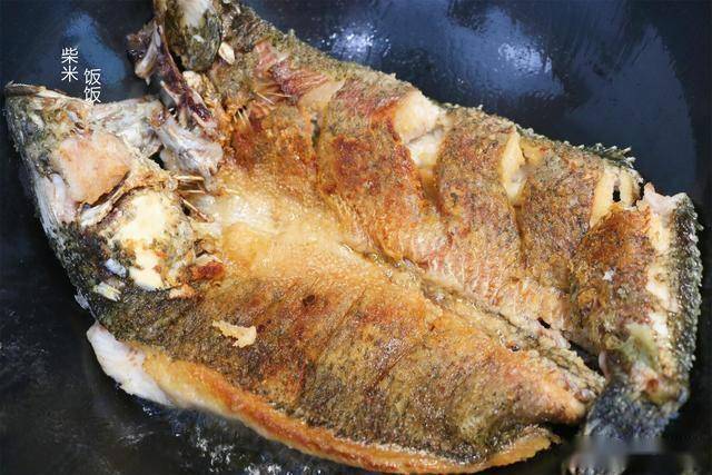 3. 煎鱼:热锅凉油,放入处理好的鱼。刚开始不要推动鱼,鱼比较大,可以倾斜锅把鱼头和鱼尾煎均匀。煎到底边定型再转动鱼,煎到一面焦黄就可以翻面了。再把另一面煎一煎。