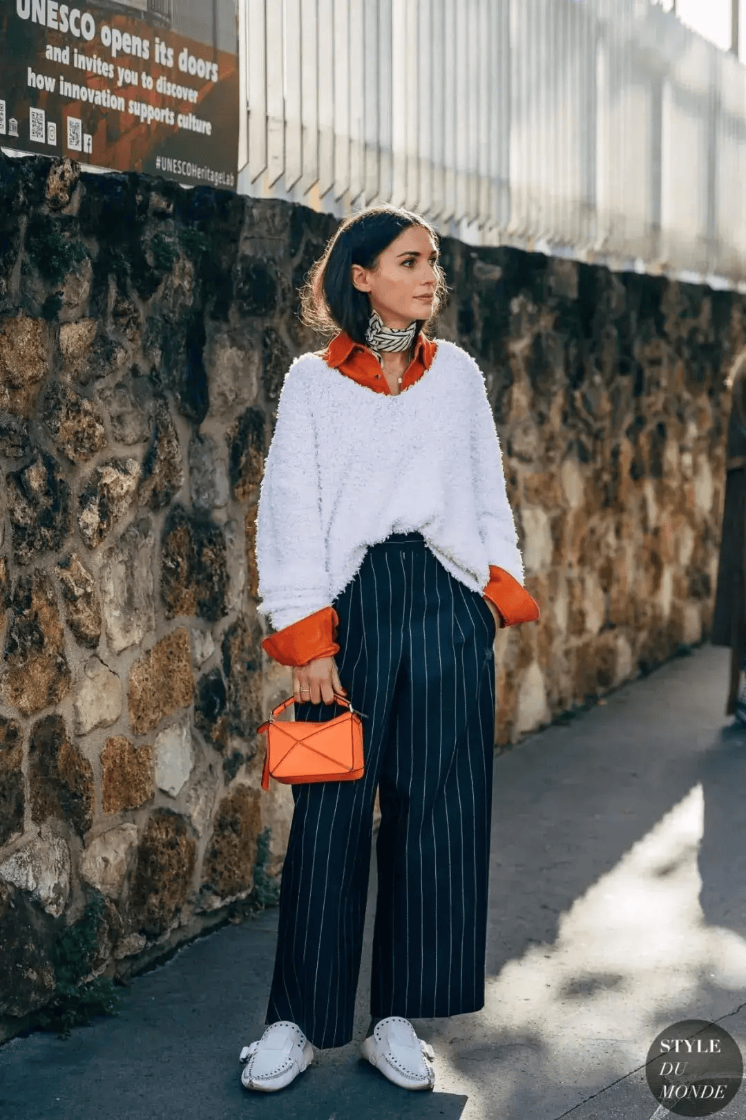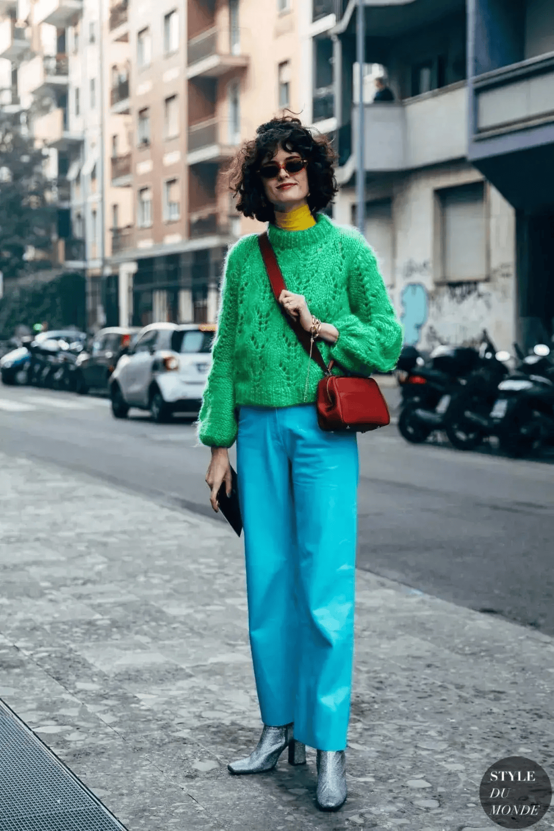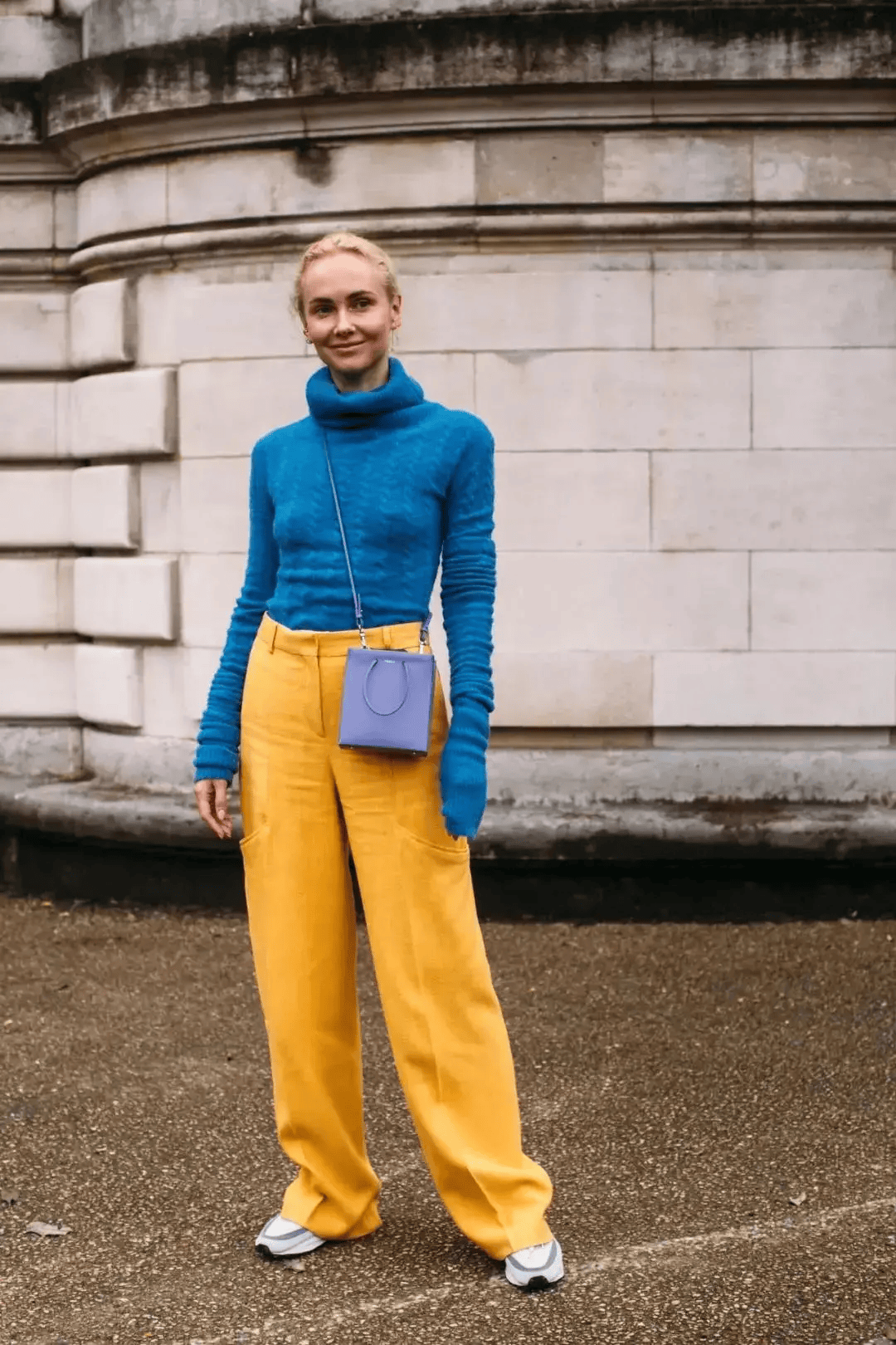 亮色毛衣+亮色阔腿裤, 它能营造出女人的优雅和知性阔腿裤的随性宽松感,更显女性的自信大方休闲又自在,两个单品随性中和一刚一柔,平衡真的很有质感