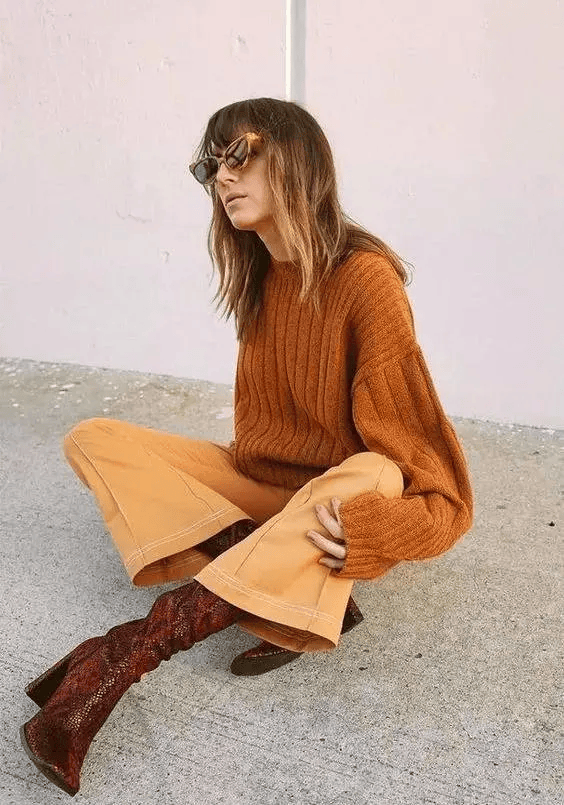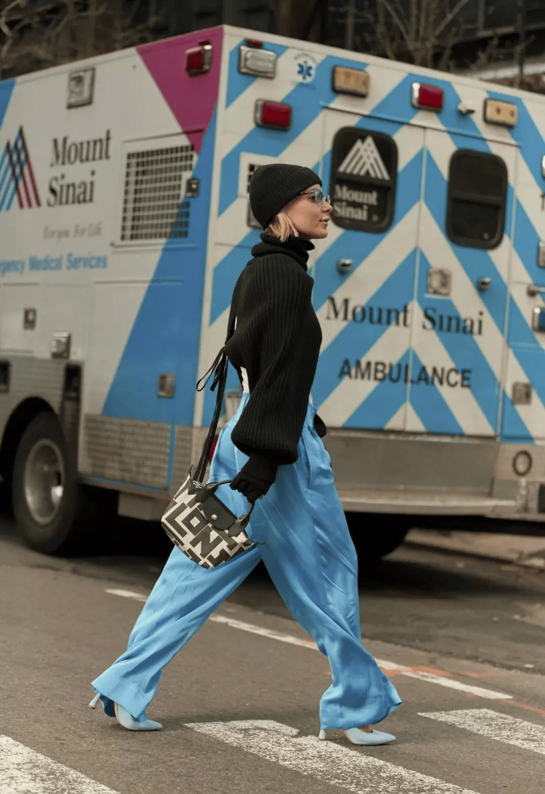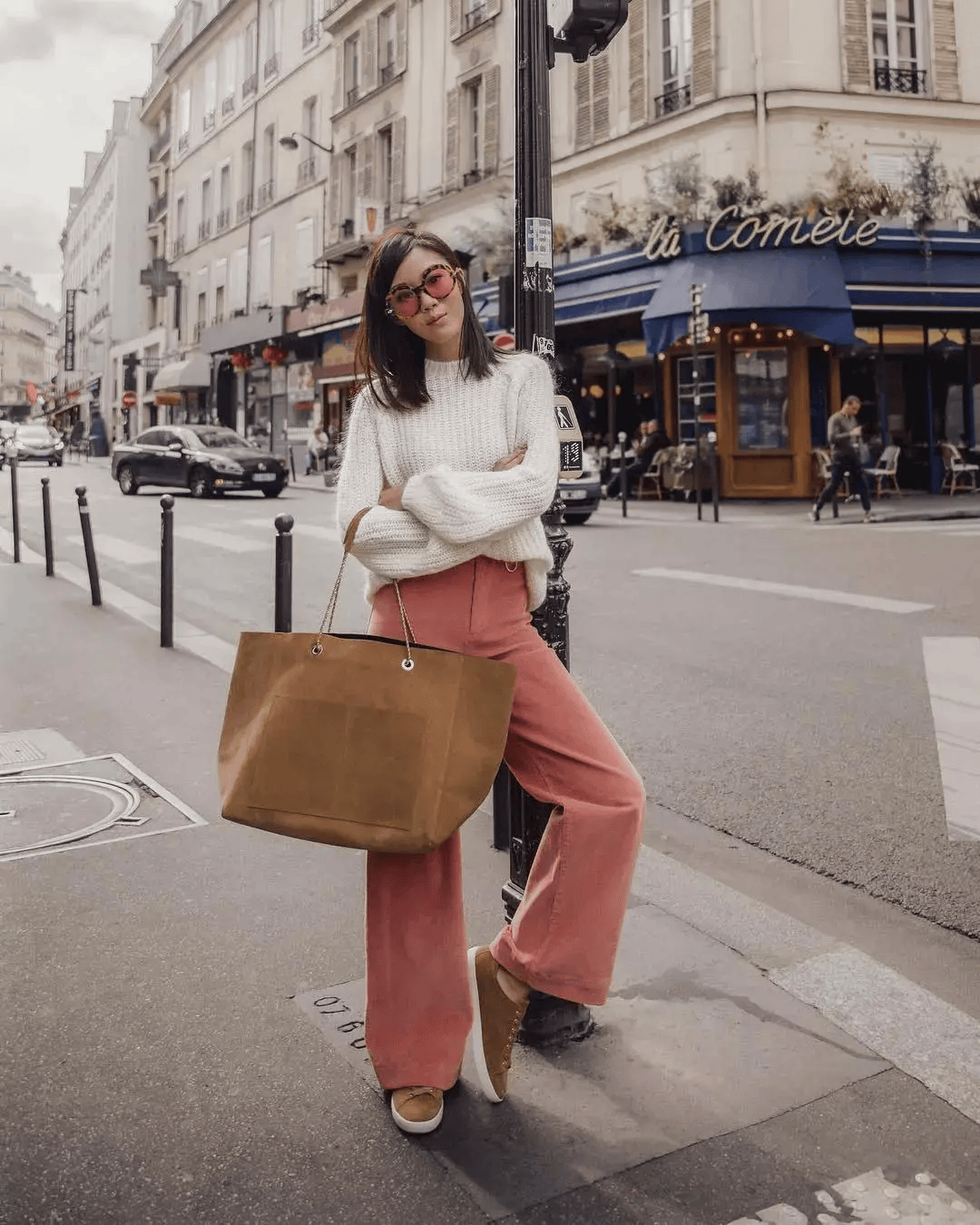 亮色毛衣+亮色阔腿裤, 它能营造出女人的优雅和知性阔腿裤的随性宽松感,更显女性的自信大方休闲又自在,两个单品随性中和一刚一柔,平衡真的很有质感