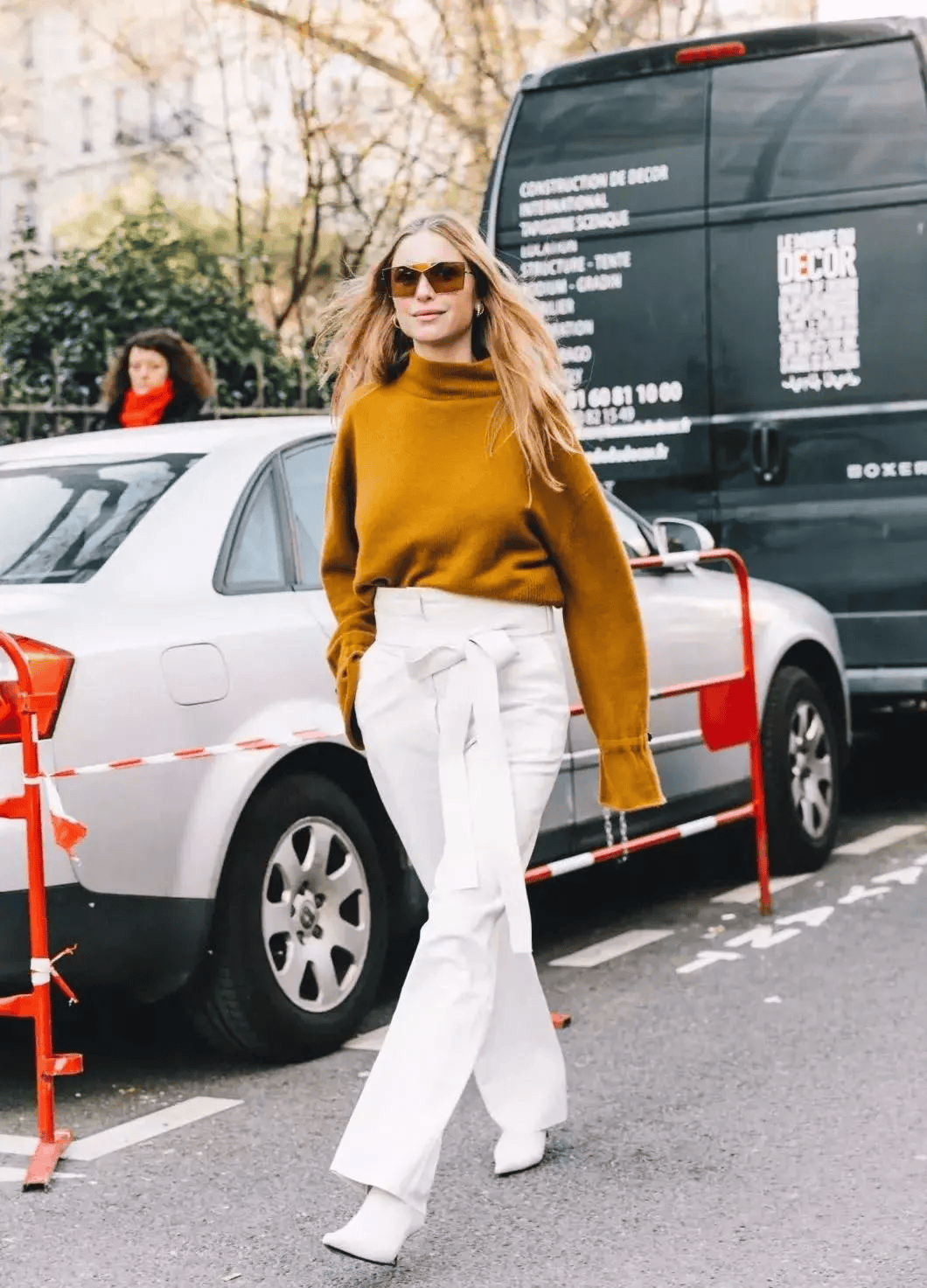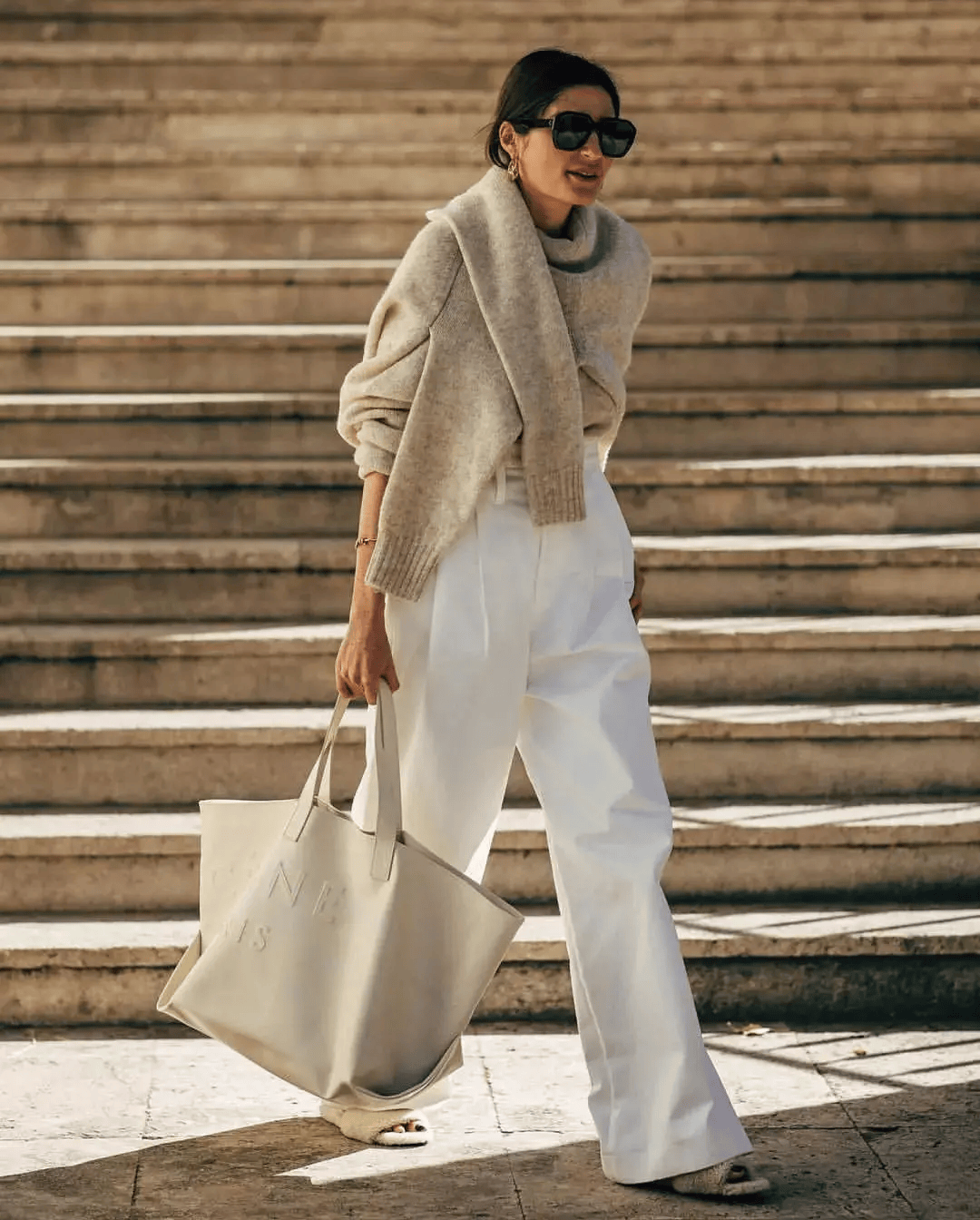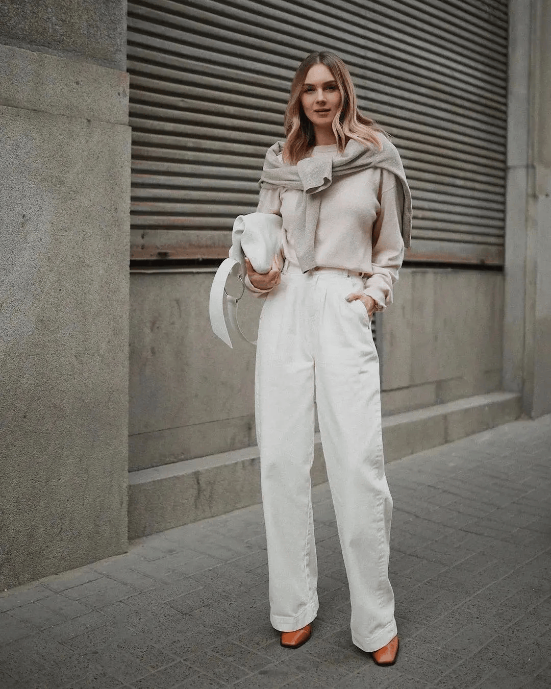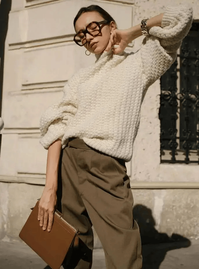 粗针毛衣+阔腿裤,穿搭一起不仅大气还能塑造随性又舒适的气质感,麦色毛衣与白色阔腿裤搭配一起,干练又不失优雅,任何场合都能让女性穿出独立气质感!