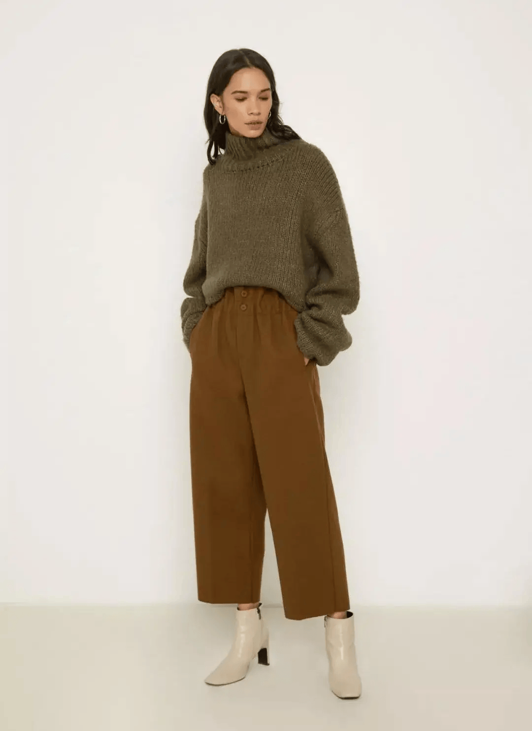 毛衣+阔腿裤+粗跟踝靴,它散发着一种不言而喻的气质风格,给予女性更多的自由与舒适,为女性穿出独一无二的气质,营造女性独立、自信、充满力量
