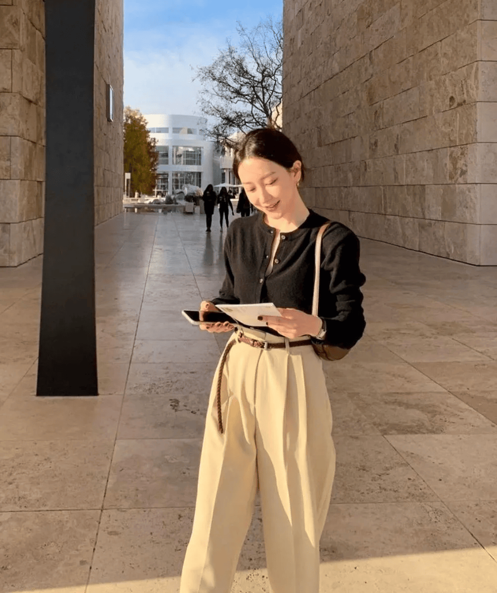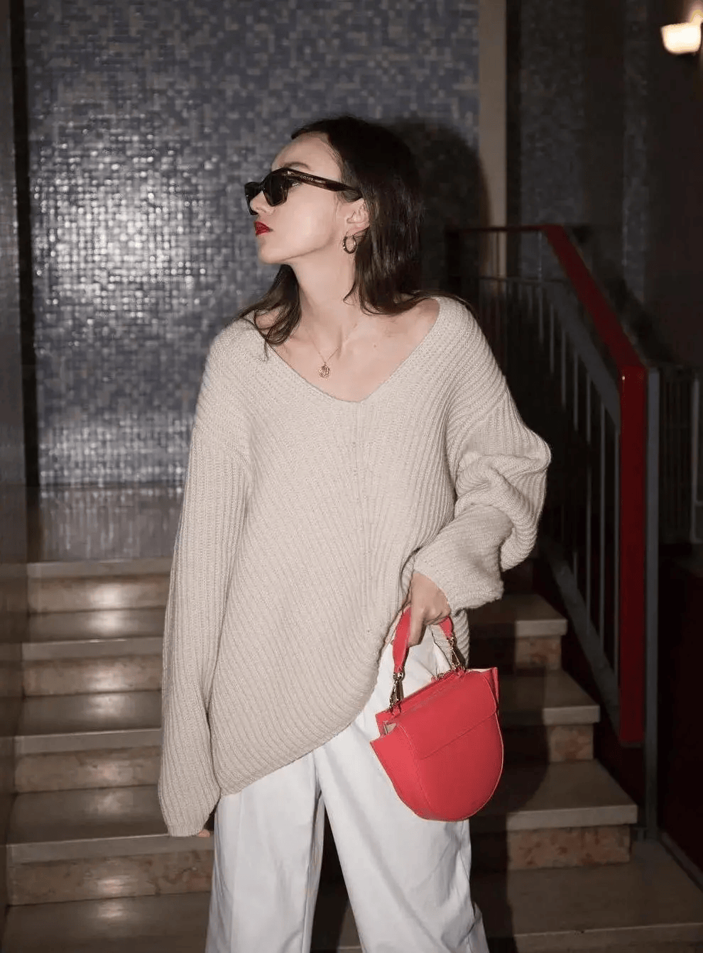 通勤风:V领针织毛衣 + 西装阔腿裤 + 高跟鞋,通过“上短下长”或塞衣角提升腰线,打造三七分比例。