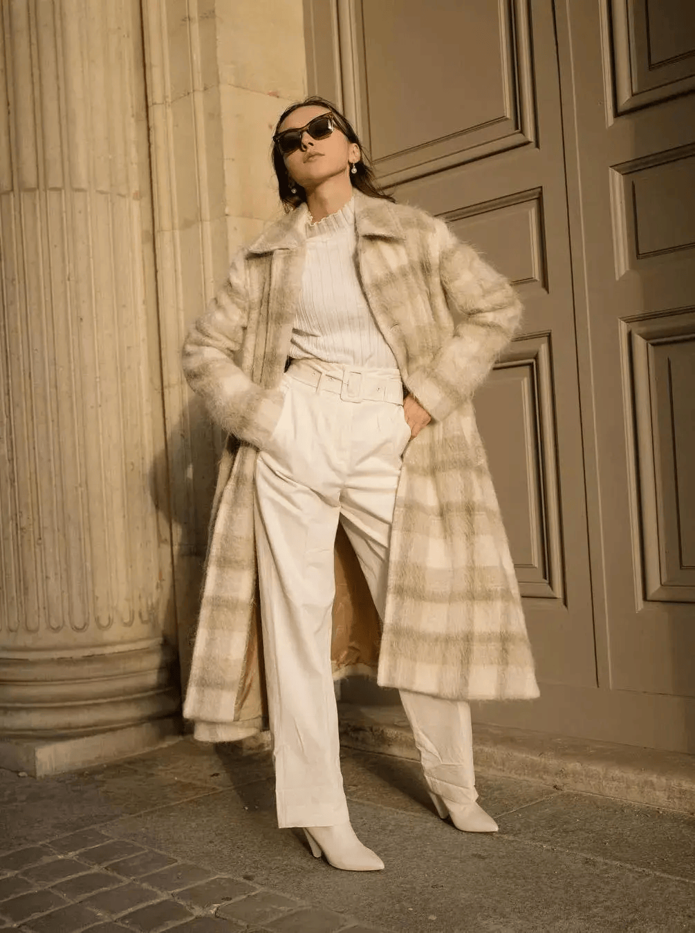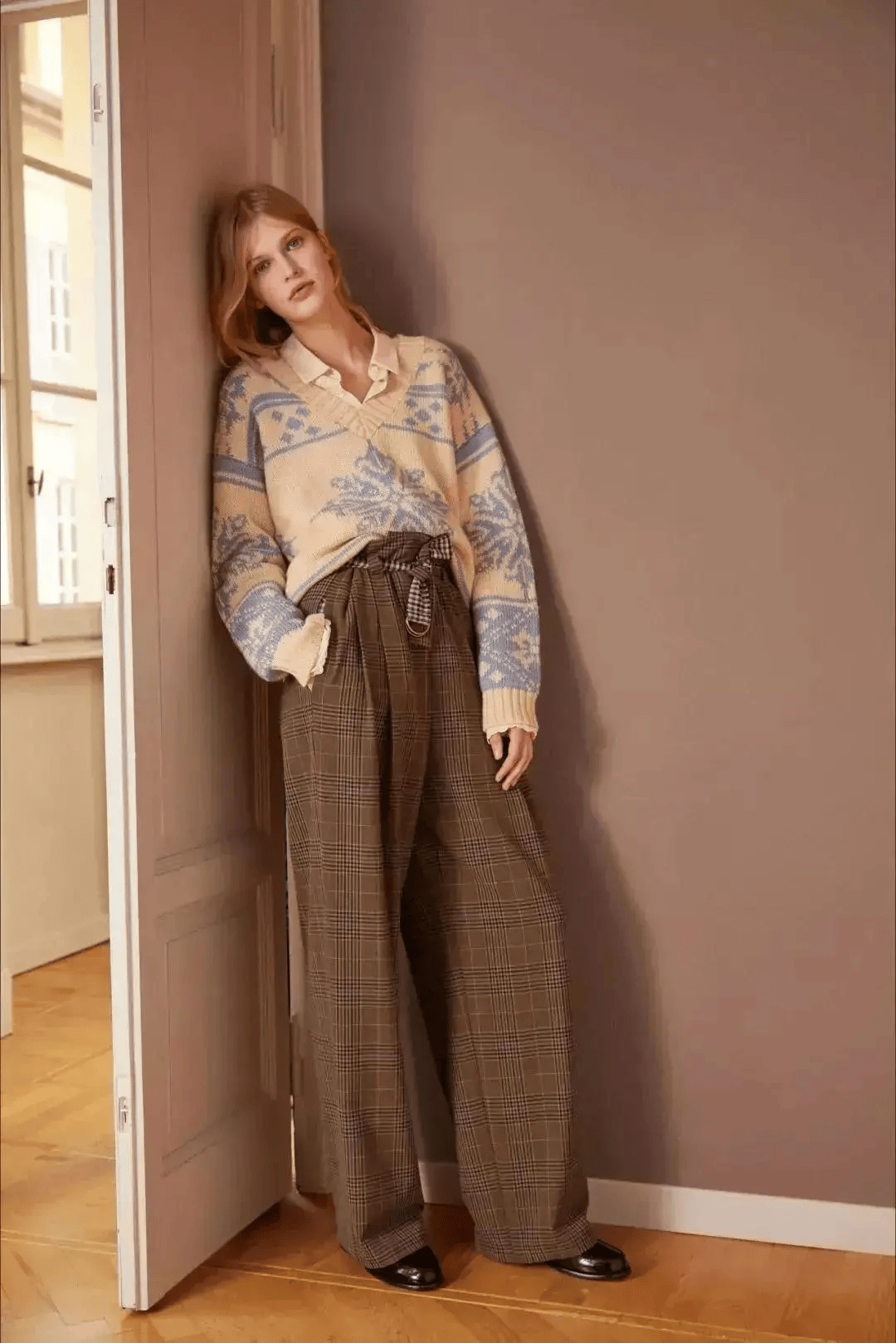 复古风:马海毛毛衣 + 格纹阔腿裤,利用温暖色调(如棕褐色)增强氛围感。