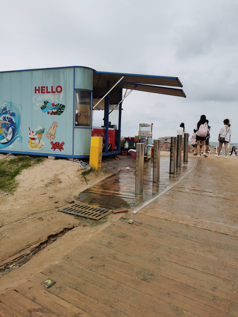 下午1点多,突然天空飘来一片乌云,下起了小雨,渐渐的,雨越来越大。于是人们纷纷赶往岸边。我们也终于可以撤了,兔兔只带了一把伞,另外几个人只得淋雨。等我们走到岸边冲脚的地方已经不下雨了,扫码2元冲60秒,这个真心不贵记得厦门要10元。扫了3次码把两只仔都冲了一遍,二仔由于掉到海水里身上全都湿了,因此担心海水会腐蚀他的皮肤,把他衣服全都脱了蹲在水里边冲。水冲到他小鸡鸡,这时他大叫一声我的蛋蛋,引来路人的围观,旁边两个男生一直在看着他偷笑。冲脚的时候,发现二仔脚上划了很多伤口,他在礁石上摔了一跤,把鞋摔飞了,伤口很深。幸好兔兔带了碘伏,冲完脚以后涂在上面,又粘了创可贴,再穿了袜子,又能走了。出门在外,碘伏和创可贴是必备的,永远都要携带在身上。