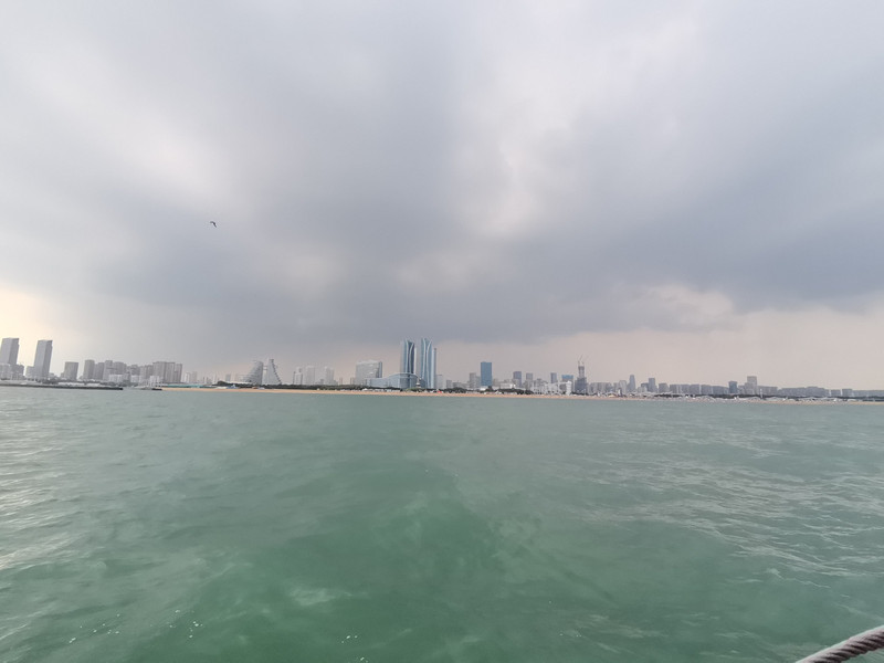 帆船开到一半,突然飘过来一大片乌云,把我们的头顶给盖住了。原本平静的海面上,海浪突然大了起来,欢快的波涛突然变得狰狞,海水也开始发绿发黑,原本金黄色的海滩,突然像是被阴影笼罩。狂风大雨又要来袭,幸好我们已经快回来了。这时候也有别的帆船出海,得体验一把大风大浪了。海浪大了,兔兔开始晕船,团员拿了几个小玩意儿兜售,10块钱一个便宜卖的,因为他们明天就要下岗了,日照帆船只有暑期的生意。兔兔本来想帮帮忙买的,10块钱也无所谓,但是因为晕船所以就没有买,始终有点内疚。说起来当地做旅游行业的人挺不容易的,一年就挣两个月的钱,但大头都是老板挣的,底下的工人挣不到多少钱谋生,难怪日照的GDP在山东排名靠后。这次坐帆船的经历,让我深刻体会到以后可千万不能坐游轮,要不然我肯定会晕死。