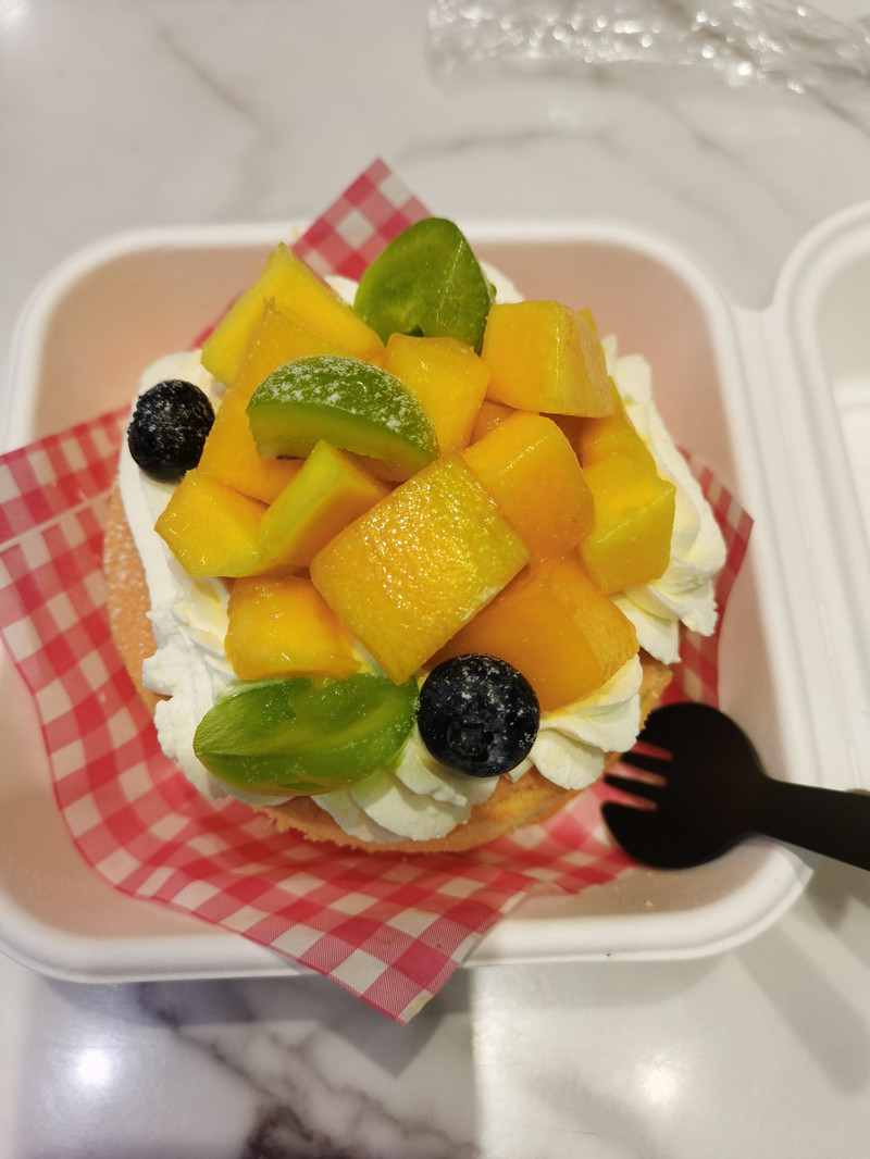 除非在这边坐下来点菜吃烧烤,要不然没地方坐,加上天气很热,于是打车回去了。吃完回家还差点意思,于是兔兔又订了蛋糕和水果,山东本土的面包品牌丹香网上口碑不错,兔兔订了巴斯克蛋糕和面包,味道都挺好。