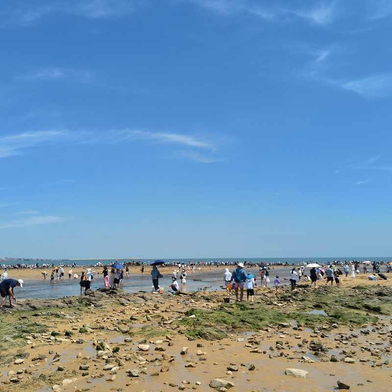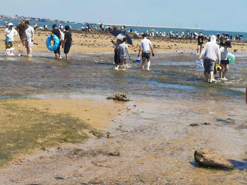 太公岛牡蛎公园打车5分钟就到了,先要经过一片森林,走个500米才能到海边。查了潮汐精灵小程序,今天日照港退潮的时间比较晚,下午1:57才是退潮的低点。涨潮时间适合游泳,因为水比较清,退潮时候适合赶海,水有沙泥比较浑浊。退潮前2个小时是最佳赶海时间,我们11点到的时候,这边沙滩上已经有非常多的人了。这里属于礁石区,加上日照的海比较浑浊,所以不适合游泳。