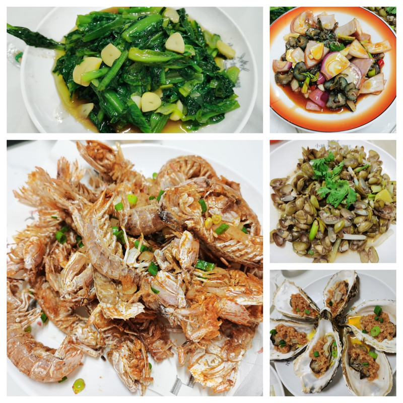 一楼是很大的农贸市场,二楼有加工和卖服装、被子等用品的商店,但要冷清很多。二楼东边的小福子海鲜加工网上风评比较好,每样东西都称了一下,综合贝类用的是酱爆的微微辣,生蚝用的是蒜蓉的,皮皮虾是椒盐,海瓜子是葱姜炒,海参是捞汁。加工费一共才106块很便宜,还点了18元一份的蒜蓉油麦菜和5元一瓶的冰红茶和果粒橙。微辣的贝类还是有点腥,而且有沙,踩坑。生蚝新鲜多汁,海瓜子也有点沙味道还行。捞汁的海参脆脆的,微辣但很劲道。油麦菜很大一份。最好吃的是皮皮虾,甜甜的特别好吃很新鲜,但有4个是死的。这边市场老板都不允许顾客自己捞皮皮虾,估计就是想卖死的,下次需要自己带个水桶,买完一个一个拎出来看死活。皮皮虾不便宜,死的可亏大了。但这边60一斤大的,楼下御尚鲜要138一斤。
