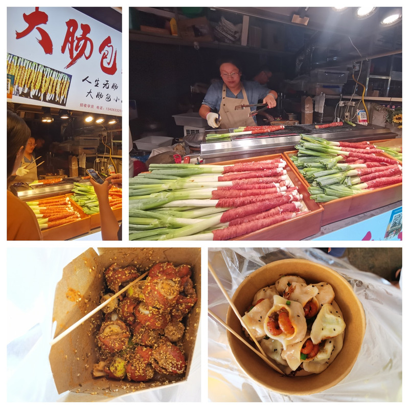 吃到七八分饱,打车去兴业大学城夜市。这边的夜市其实是围起来的一块空地,类似于停车场大小的地方上有一排排整齐的小摊。小摊上全都摆着各式各样的小吃,和东夷小镇一个原理,里面热火朝天,温度比外面要高个5°。价格不便宜,两只仔买了冰粉15一份,兔兔买了网上有名的开口笑生煎包和大肠卷大葱。生煎包三种口味,20元一份。有龙虾口味、鲜肉的、还有蒸饺。大肠卷大葱有三种20、30、25。30的是大肠头,25的是大肠中段,20的是大长尾。老板说大肠头最好吃,因此兔兔买了30的大肠头,味道很好。