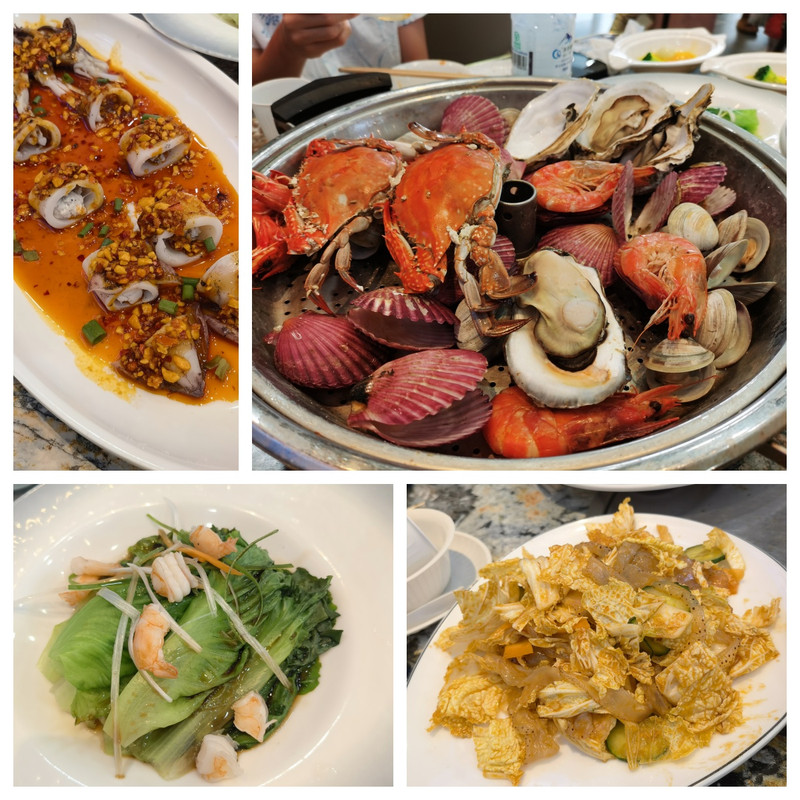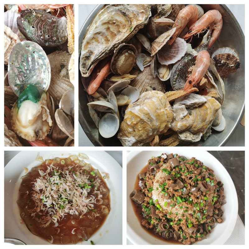 餐厅服务态度很好,人手充足,让我感慨选酒店还是要选大企业旗下的,工作流程更加标准化,人员素质、人员培训、企业管理都更好。来这边吃饭的都是住客,拿着入住送的蒸汽海鲜锅兑换券过来使用,另外再点几个配菜。单点蒸汽海鲜锅要158,但其实里边内容,没多少,成本也就三十吧,品质比较一般,海鲜看上去脏兮兮的,当天早上海捕的沙泥比较多。在上海没有吃过蒸汽海鲜锅,到这边遍地都是,几乎每个当地餐厅的套餐里都有蒸汽海鲜锅这道菜。但是今天比较失望,蒸出来盖子一打开一股腥味扑面而来,不是一锅鲜,而是一锅腥,海鲜还是用葱姜炒更好吃。鲍鱼都是发绿的,服务员说把绿色的袋子挑掉就能吃,这让我以后都不敢再吃鲍鱼了,如果是做成鲍鱼红烧肉,你都看不出来这鲍鱼原来什么颜色。有一个扇贝里全部都是沙泥没有肉。我们又点了60元的肉末海肠捞饭,9块9的海凉粉,两个9块9一个的蒜蓉牛角贝。海肠捞饭味道中规中矩,海凉粉是凉粉浇一点虾皮再拌一些海鲜汁,满蛮清凉的。牛角贝是一种三角形大壳的生蚝,蒜蓉粉丝蒸的味道挺好,里面还有一块仙贝肉。带两只仔出来玩的好处就是有人可以帮我们分食,之前兔兔楚两只出来实在点不了多少菜,总是吃不完,而且山东的菜量又大。