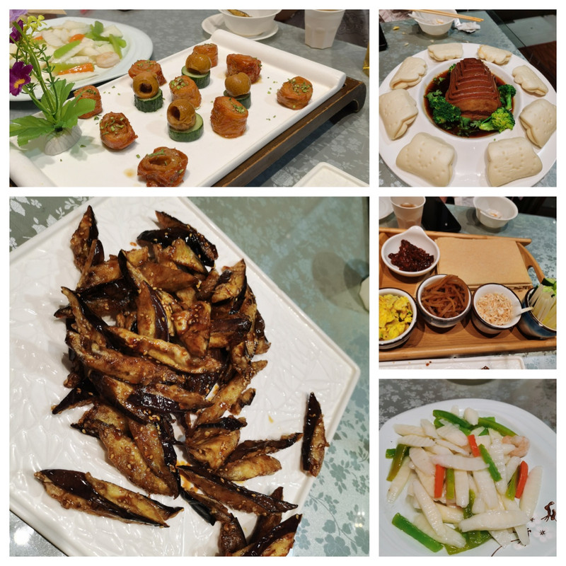 万达广场出来走路500米去吃地道鲁菜,鲁地名轩的风味茄子和九转大肠比较有名,自从十几年前兔兔在陆家嘴的老山东鲁菜馆吃过烹茄子后就被惊艳到了,终于又吃到了久违的味道。风味茄子只要18,油炸得脆脆的茄子裹上酸酸甜甜的酱,芯子又是软的,太好吃了。九转大肠79也是甜口的非常入味,但是只有9个。老板娘介绍说,她家不做预制菜,大厨都是花了好几万请的。另外我们还点了宝塔肉59,价格不贵但味道一般,是纯咸口的酱油烧五花肉,宝塔肉还是杭帮菜知味观的最好吃。另外还点了个虾仁养生小炒28,这道菜和图片相距胜远,端上来只有山药、莴笋和3个虾仁,而图片上还有黑木耳和白果,虾仁也更多。问店家为啥和图片差那么多,说是黑木耳浸泡时间长,怕客人等。其实大家都知道备菜应该是提前备好的,这个理由有点牵强,再问为啥没有图片上的白果,店家就不高兴了。本来觉得这些菜就够了,但老板娘极力推荐了山东煎饼包小料38,这个有点失望,就是普通的山东煎饼包黄豆酱、虾皮、黄瓜、炒蛋、榨菜和大葱。里边的馅料都特别咸,饼也比较硬,卷在一起咬不动,这个吃不惯,性价比不高。