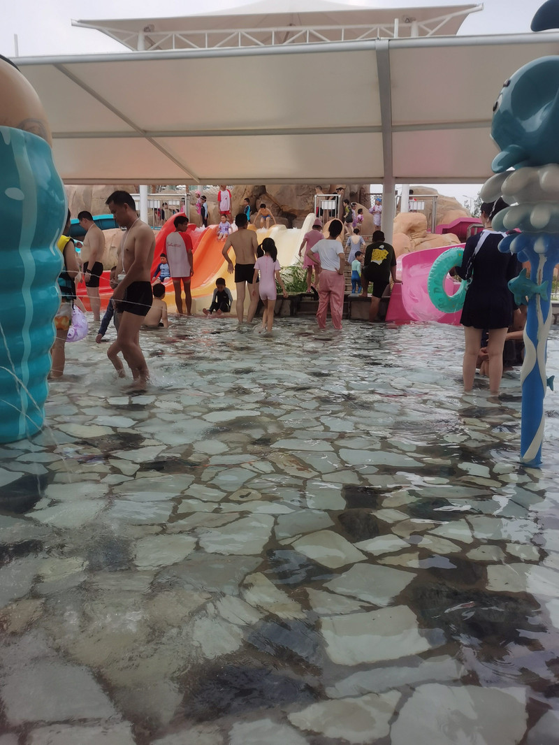 由于游客众多,在水乐园里都穿着自己的拖鞋走,地上也很脏,到处都是黑乎乎的水。森泊没有想象中那么高端啊~,幸好没有订森泊的酒店,旺季房间接近2000,唯一的好处就是水上乐园出来可以直接回房间洗澡,乐园和酒店侧门是相通的。水乐园的设置还是非常合理的,几个项目挨的都很紧凑,不需要走太多路,但是玩项目不可以带手机眼镜这些物品,只能放在旁边的格子里无人看管还是比较麻烦的,水乐园的项目都是大同小异,无非就是各种形式的滑梯漂流。
