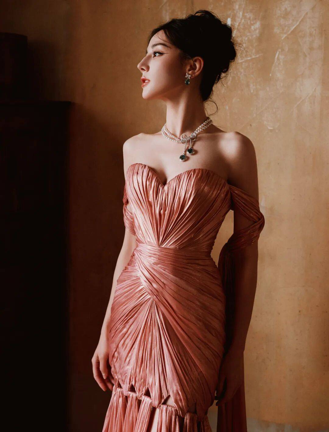 熟悉迪丽热巴的人都知道,她自带浓郁的异域风情,从《三生三世十里桃花》里的凤九,到《你是我的荣耀》里的乔晶晶,每个角色都让人印象深刻。她曾说 “我喜欢尝试不同的造型,想让大家看到多面的我”。这次抹胸裙妆造就把她的优势展现得淋漓尽致 —— 她的肩颈线条优越,抹胸设计刚好露出精致的锁骨和天鹅颈,搭配一头大波浪卷发,发丝随意披散在肩头,侧脸的轮廓立体又精致,加上她自带的强大气场,站在镜头前就像发光的焦点,大气感直接拉满。