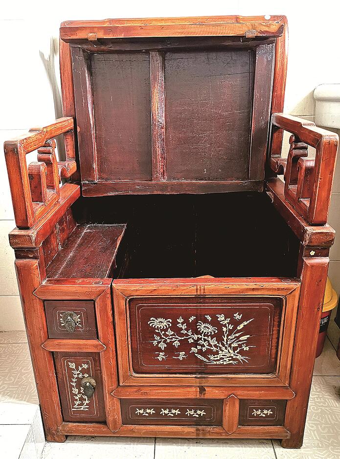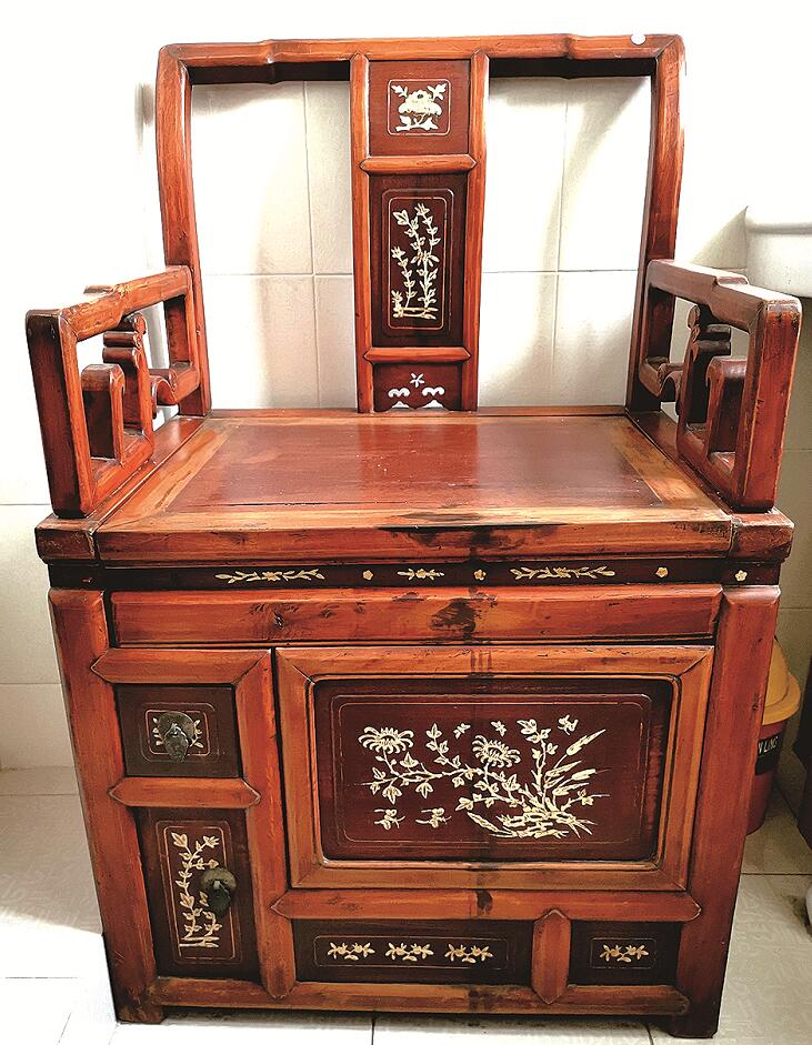 这把通体梓木、高105厘米却“看不见腿”的甬式骨木镶嵌椅其实是一把“马桶椅”。