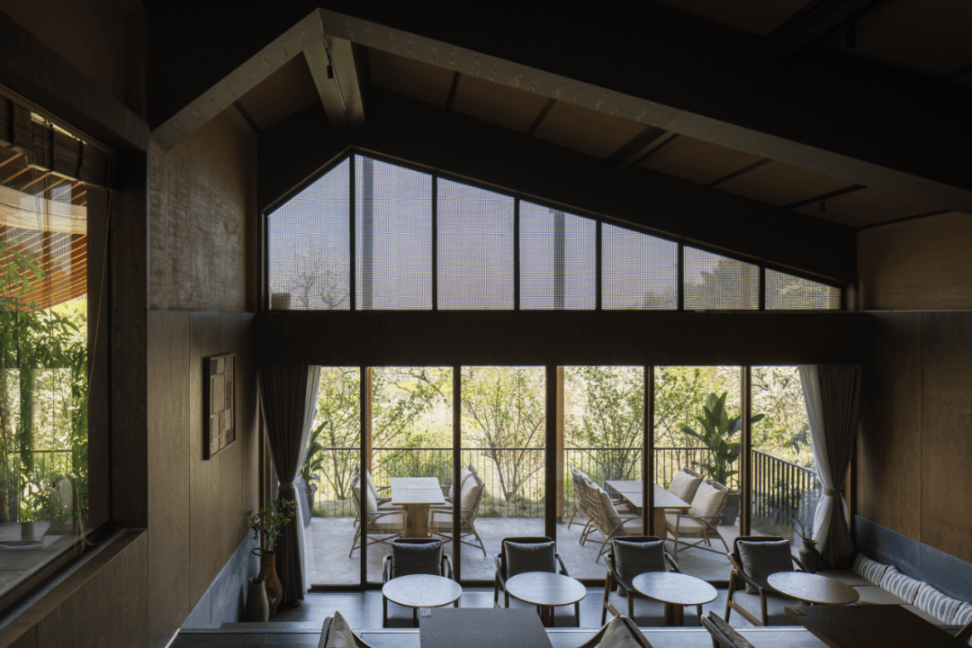 - 望岳则设置竖向高窗与角窗,在仰视角度中框取远山剪影,晨昏之间云雾缭绕,恍若山水立轴。