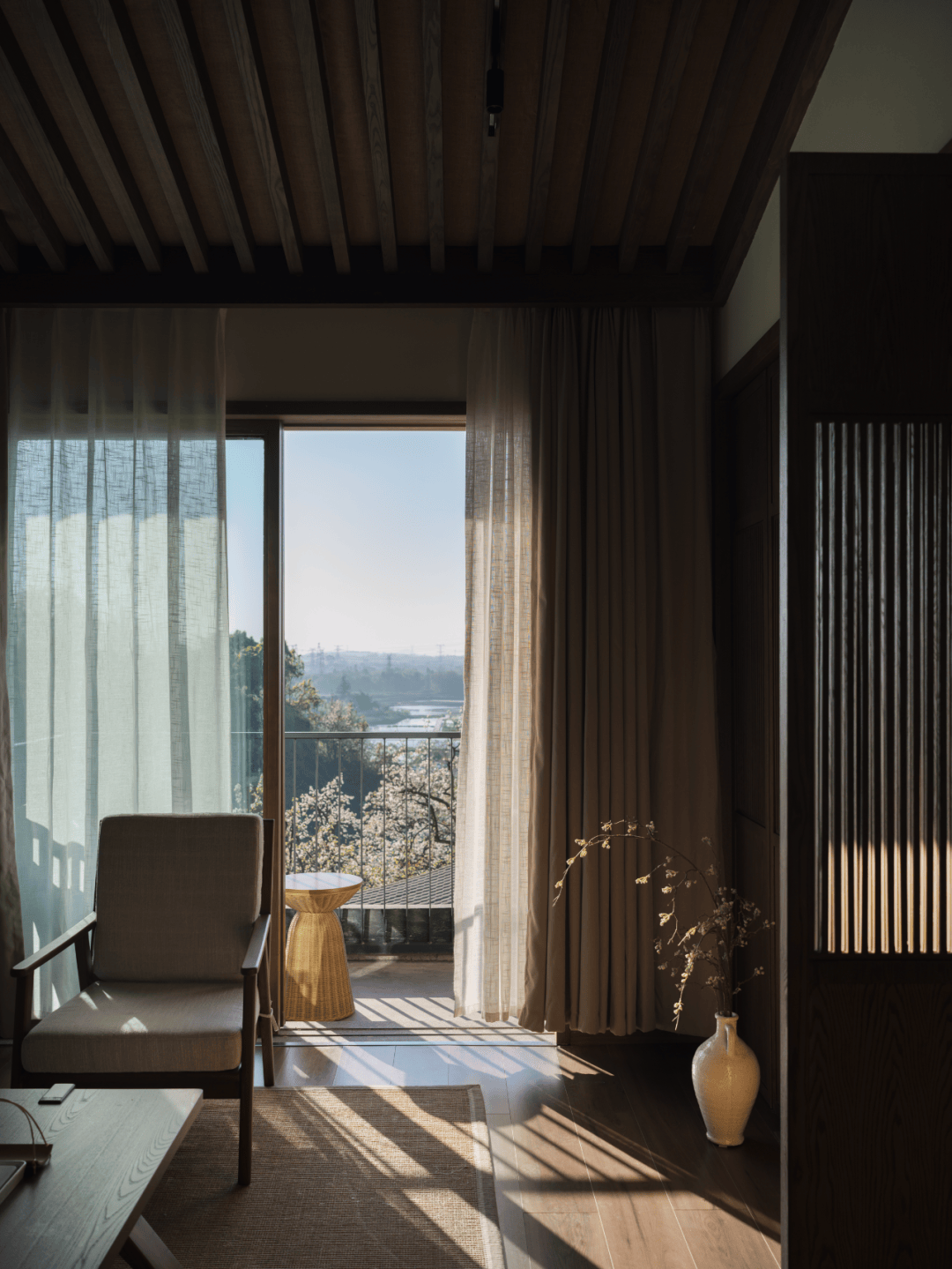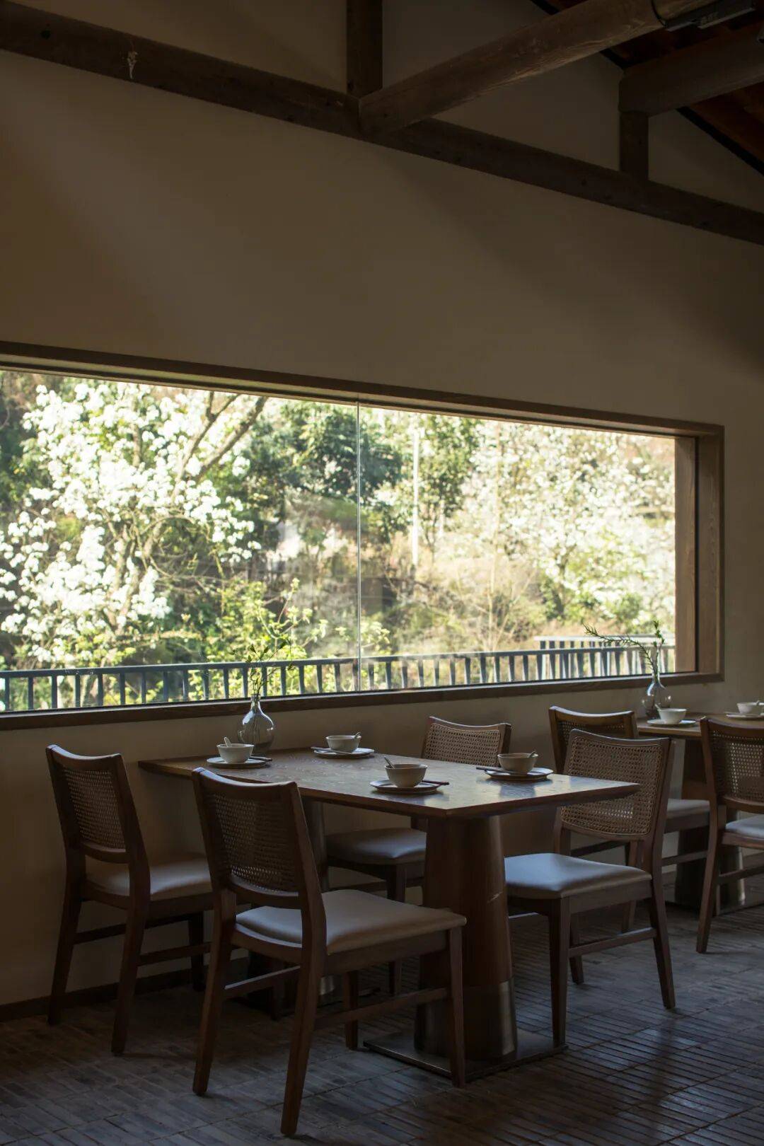 - 明月以横向长窗与落地推拉门,营造“卷轴式”视觉体验,春日梨花如雪飘落庭院,尽收眼底;