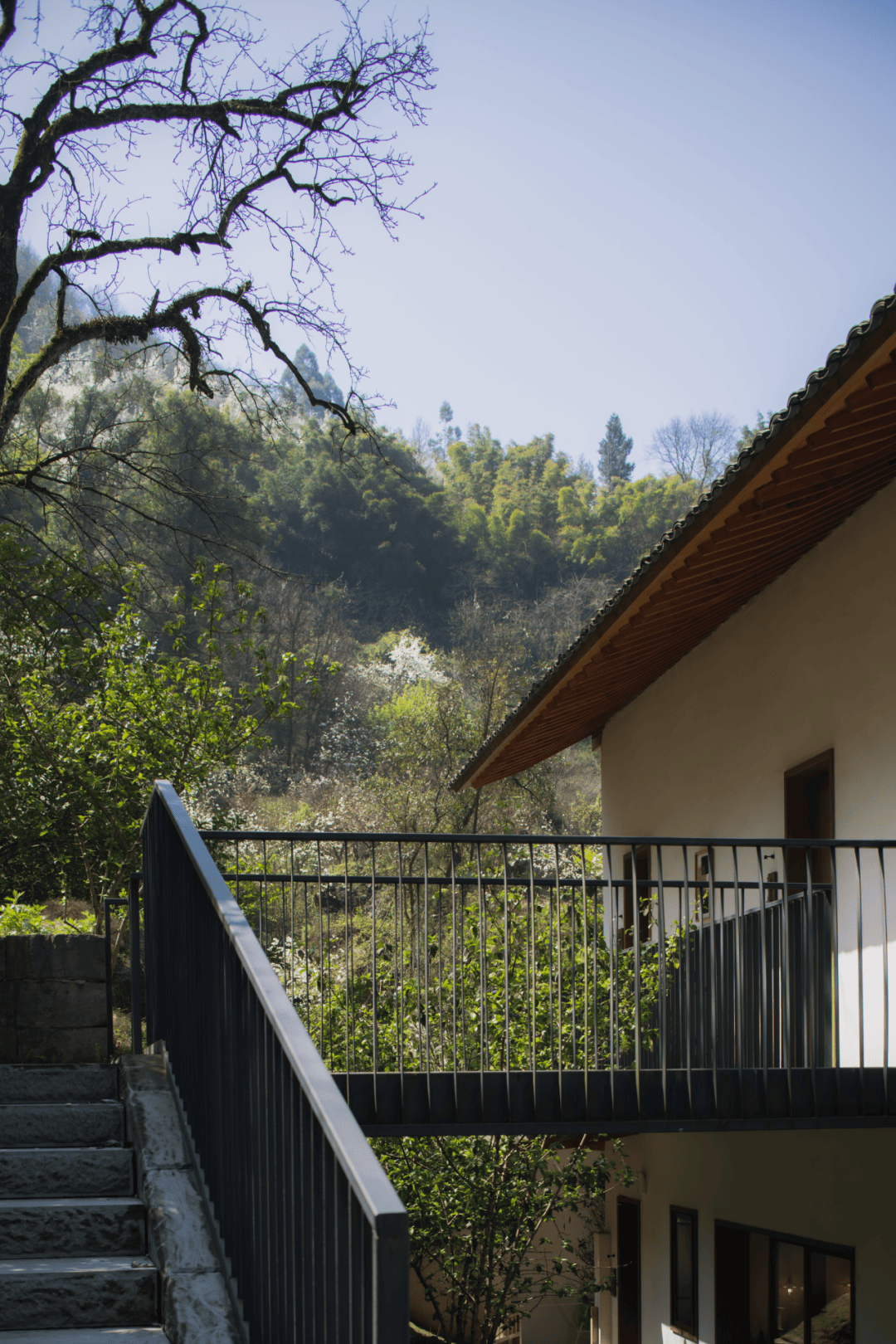 明月与望岳均顺应原有梨园坡地走势,采用“点状散布、低密度嵌入”的布局策略,避免对百年梨树根系与生态系统的破坏。建筑以微介入方式“浮”于林间,通过架空、错层、退台等手法,使屋宇如从土地自然生长而出。