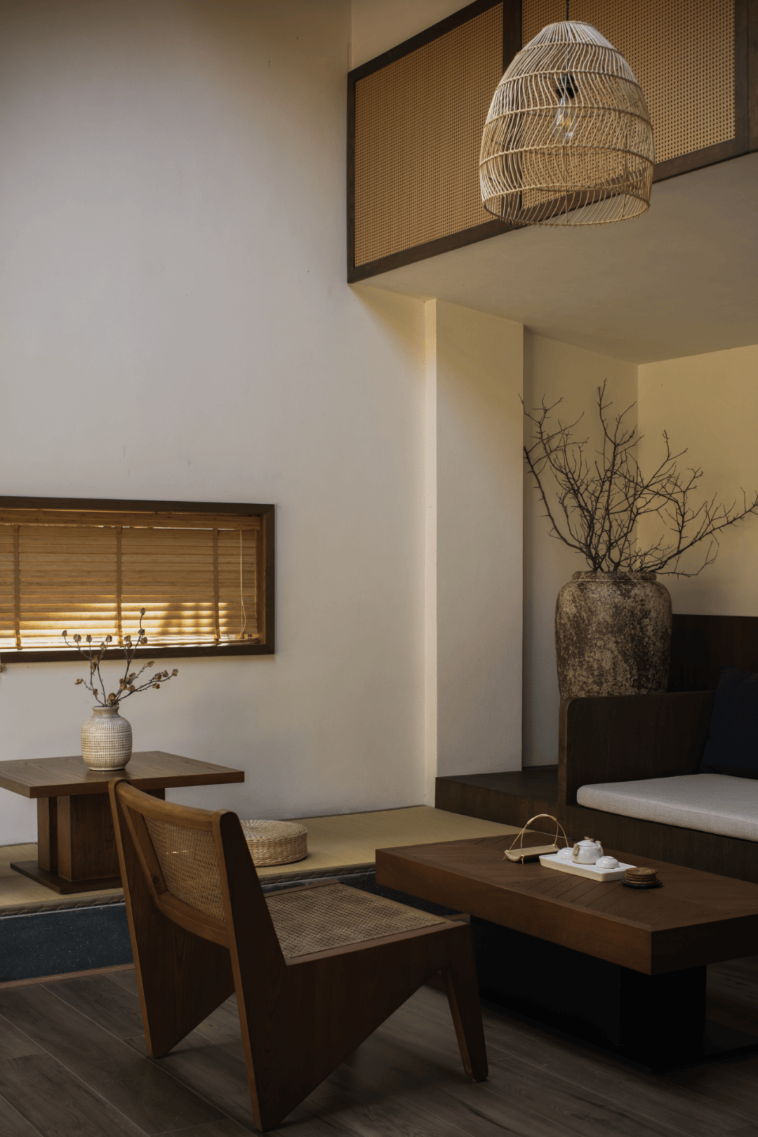 室内整个空间延续了阴翳淡然的气质,淡雅柔和的色调与温润的木材结合,将度假感和自然感巧妙融合在了一起。通透的落地门窗将室外自然引入室内,每一个角落都散发出不动声色的拙雅之美。一件家具、一扇窗、一束花、一缕光..……没有繁复的装修,却处处尽显东方美学。