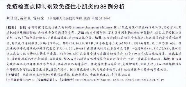 胡佳佳.免疫检查点抑制剂致免疫性心肌炎的88例分析,中国医院药学杂志,2024-12-13