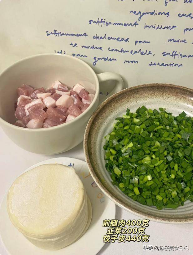 材料:前腿肉400克,韭菜200克,饺子皮440克,2勺食用油,1勺生抽,猪肉末,蚝油,胡椒粉,鸡精,盐,一个鸡蛋。