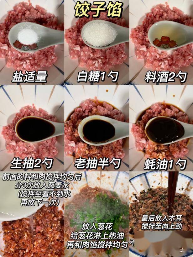 肉馅筋道:猪肉要搅打上劲(顺一个方向),这样煮出的饺子馅不易散,更紧实。