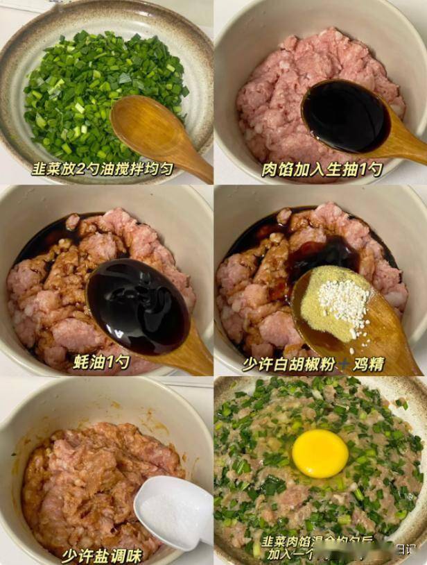 防出水技巧:韭菜切碎后先加油拌匀,再与肉馅混合;盐最后加,减少韭菜出水。